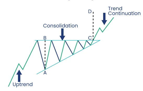 نمودار شماتیک الگوی کنج در فاز تثبیت قیمت در یک روند صعودی (Trend Continuation).