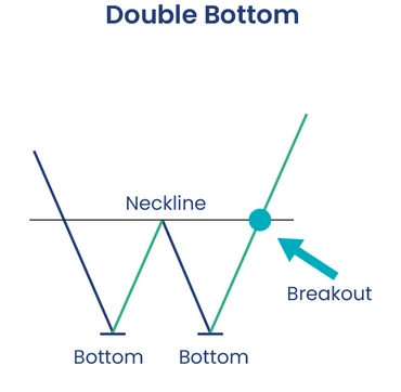 نمودار شماتیک الگوی بازگشتی دو کف (Double Bottom) که شامل دو کف هم‌تراز، خط گردن (Neckline) و نقطه شکست (Breakout) برای آغاز روند صعودی است.