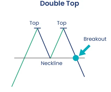 نمودار شماتیک الگوی بازگشتی دو قله (Double Top) که شامل دو سقف هم‌تراز، خط گردن (Neckline) و نقطه شکست (Breakout) برای آغاز روند نزولی است.