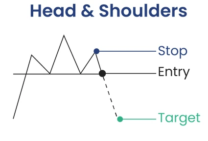 نمودار شماتیک الگوی بازگشتی سر و شانه (Head and Shoulders) همراه با سطوح ورود (Entry)، حد ضرر (Stop) و هدف قیمتی (Target) پس از شکست خط گردن.