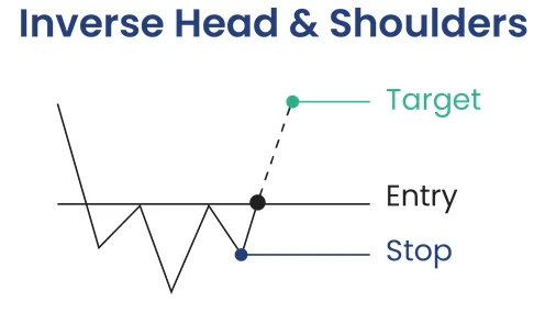 نمودار شماتیک الگوی بازگشتی سر و شانه معکوس (Inverse Head and Shoulders) همراه با سطوح ورود، حد ضرر و هدف قیمتی پس از شکست خط گردن.