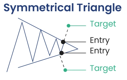 نمودار شماتیک الگوی ادامه‌دهنده مثلث متقارن (Symmetrical Triangle) در فاز فشردگی قیمت و تعیین نقاط ورود و هدف قیمتی پس از شکست.