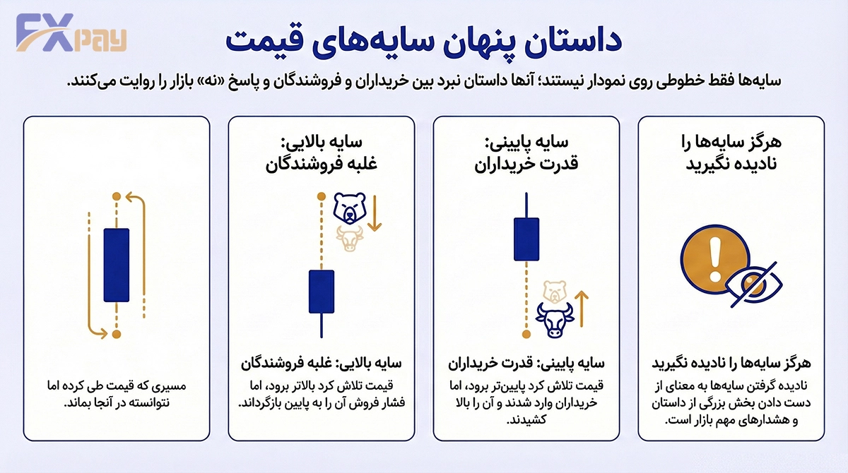اگر بدنه‌ی کندل نتیجه‌ی تصمیم بازار باشد، شدوها مسیر تلاش‌های ناموفق آن هستند. شدو بالا و پایین نشان می‌دهند قیمت تا کجا رفته، اما نتوانسته آن‌جا بماند. به زبان ساده، شدوها جاهایی هستند که بازار جواب «نه» گرفته است.