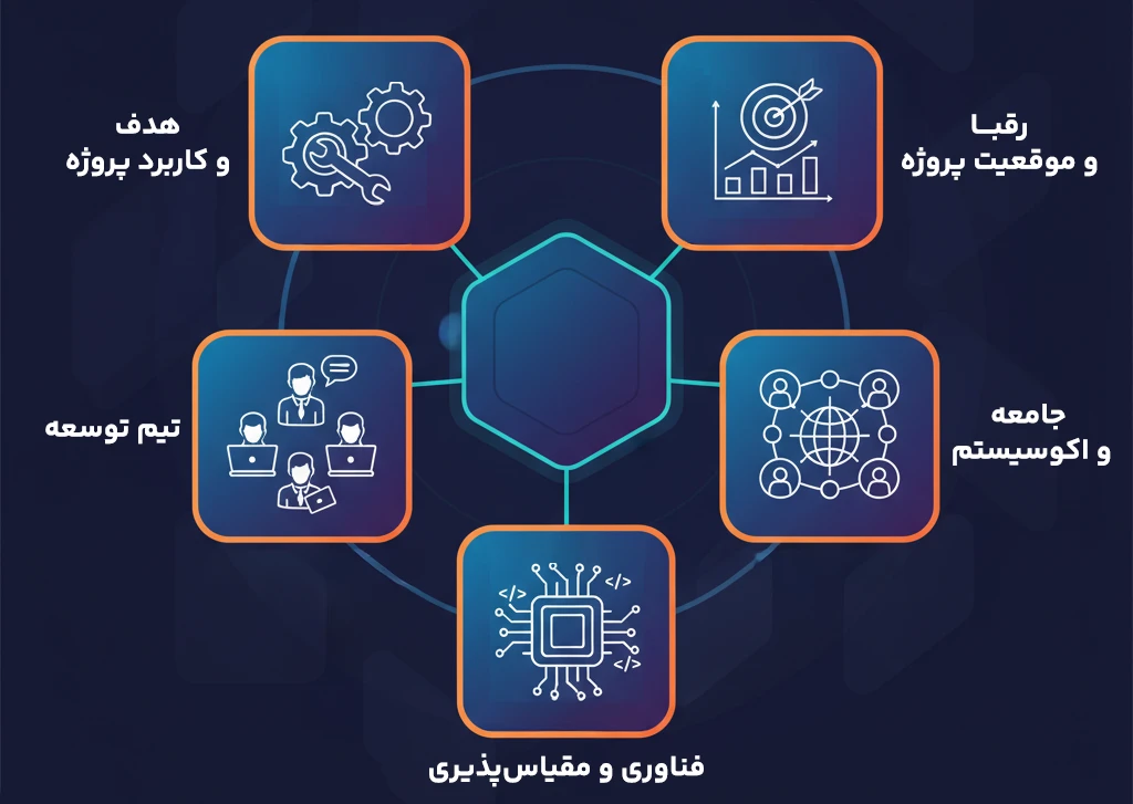 - بعد فنی: ارزیابی قدرت شبکه، امنیت بلاکچین، مقیاسپذیری، سرعت تراکنشها، و معماری کد منبع پروژه