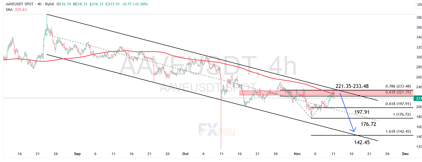 ساختار فعلی نمودار AAVEUSDT در تایمفریم ۴ ساعته کاملاً مشابه الگوی کلاسیک کانال نزولی با شیب متوسط است. قیمت پس از برخورد به کف کانال در محدودهی ۱۴۲ دلار جهش موقت داشته و اکنون در مسیر برخورد به سقف کانال در ناحیهی ۲۲۱/۳۵ تا ۲۳۳/۴۸ دلار قرار دارد. این محدودهی مقاومتی نهتنها محل تراکم فیبوناچیهای اصلاحی ۰/۶۱۸ و ۰/۷۸۶ از موج نزولی قبلی است، بلکه با خط مقاومت داینامیک کانال همپوشانی دارد.