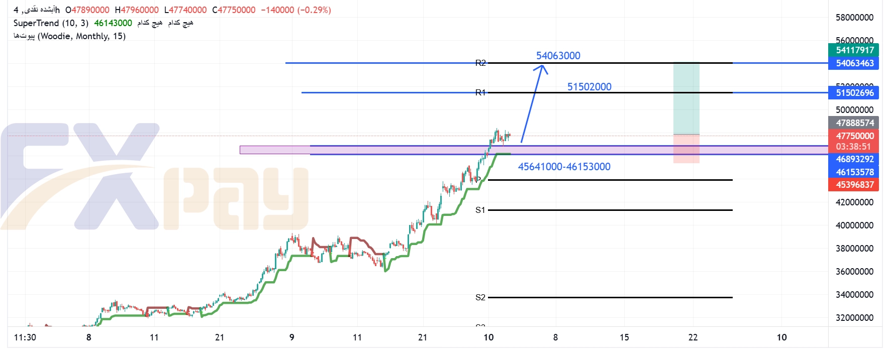چارت بهروزشده که با اندیکاتور SuperTrend تحلیل شده، نشان میدهد قیمت در حال حاضر حوالی ۴۷,۹۲۰,۰۰۰ تومان است و بالای محدوده حمایتی شکستهشده ۴۵,۶۴۱,۰۰۰ – ۴۶,۱۵۳,۰۰۰ تومان تثبیت شده است.