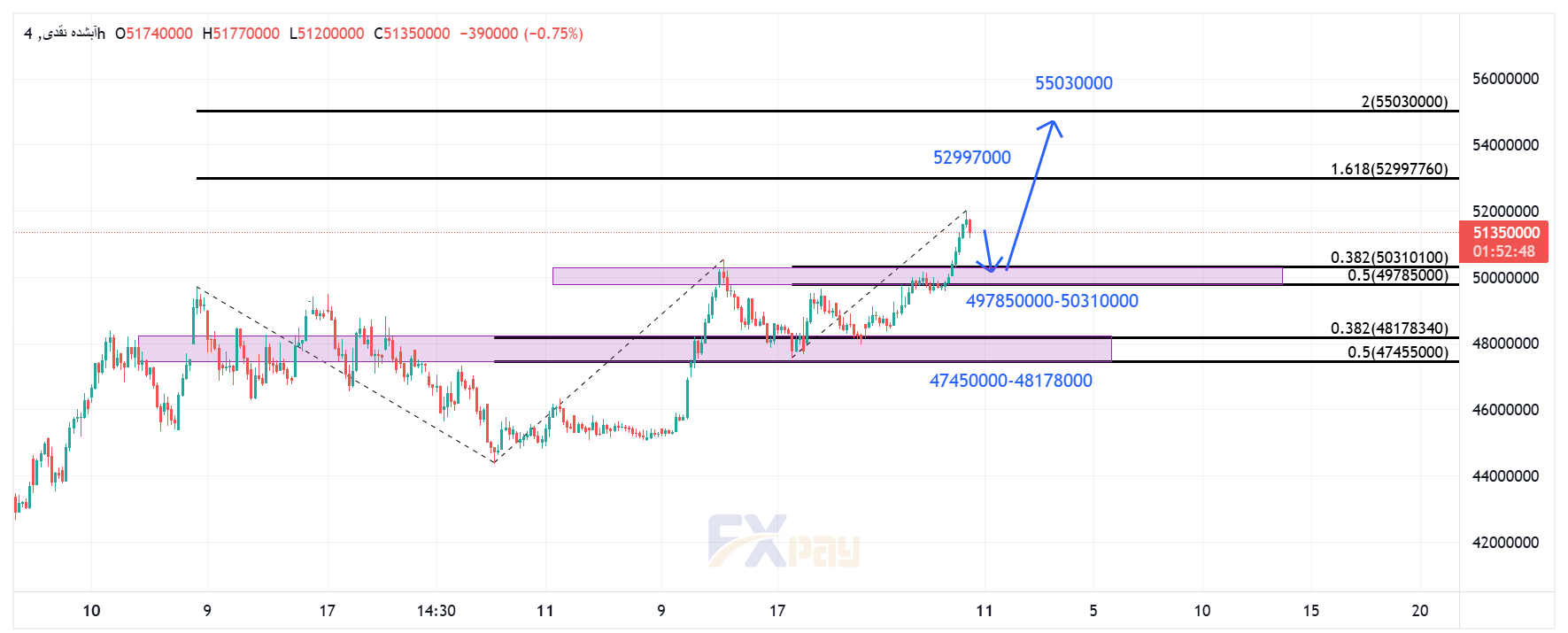 این سطح مهمترین مقاومت کوتاهمدت است. وجود نسبت فیبوناچی ۱/۶۱۸ در همین حوالی باعث میشود این سطح هم هدف و هم مانع جدی حرکت باشد. - مقاومت دوم: ۵۵,۰۳۰,۰۰۰ تومان
