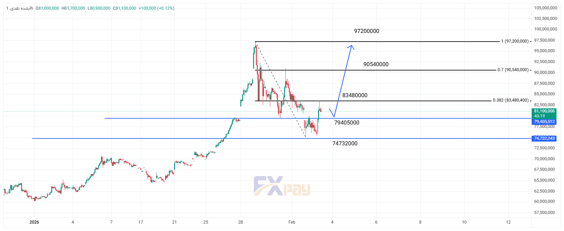 با حفظ حمایت ۷۹,۴۰۵,۰۰۰ تومان و کاهش فشار فروش هیجانی، محتمل‌ترین سناریو بازگشت قیمت به مدار صعودی و حرکت به سمت ۸۳,۴۸۰,۰۰۰ و سپس ۹۷,۲۰۰,۰۰۰ تومان است.