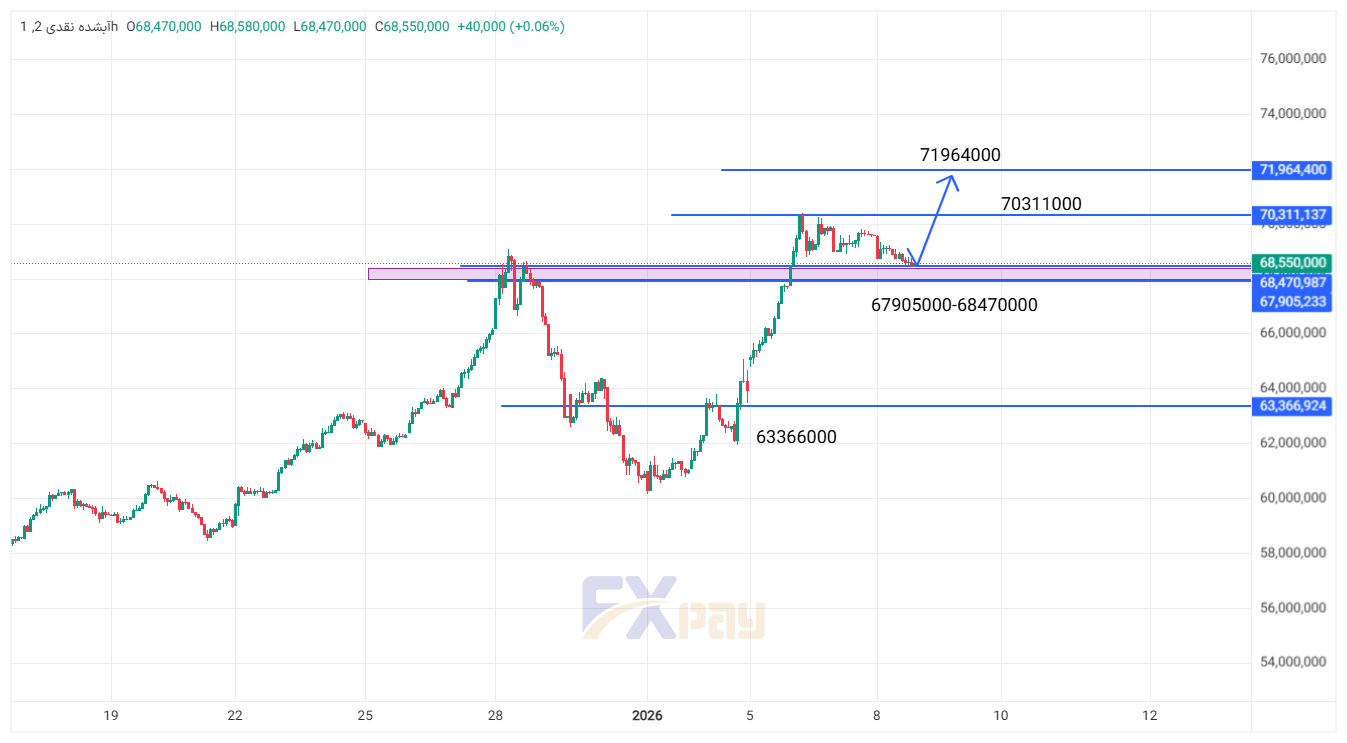 - مقاومت اول: ۷۰,۳۱۱,۰۰۰ تومان: این سطح، مقاومت فوری پیش روی قیمت است که شکست آن میتواند راه را برای رسیدن به اهداف بالاتر باز کند. این سطح نشاندهنده اوج اخیر قیمت پیش از اصلاح کنونی است و عبور از آن، تاییدکنندهی قدرت خریداران خواهد بود.
