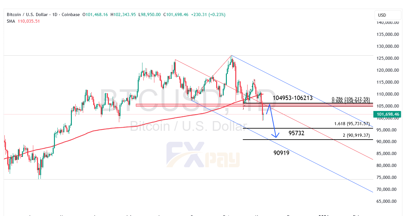 در چنین شرایطی، سرمایهگذاران نهادی که تا پیش از این بیتکوین را در حکم «ذخیره ارزش دیجیتال» قلمداد میکردند، برای محافظت از سودهای پیشین دست به شناسایی سود زدند و فشار فروش ساختاری جدیدی در بازار شکل گرفت. نمودار قیمت روزانه (D1) بیتکوین اکنون درگیر بازگشت نزولی از ناحیهی مقاومتی ۱۰۴,۹۵۳ تا ۱۰۶,۲۱۳ دلار است؛ جاییکه همپوشانی مقاومت افقی با میانگین متحرک ۲۰۰ واحدی و تراز فیبوناچی ۰/۷۸۶ (۱۰۶,۲۱۲ دلار) قرار دارد.