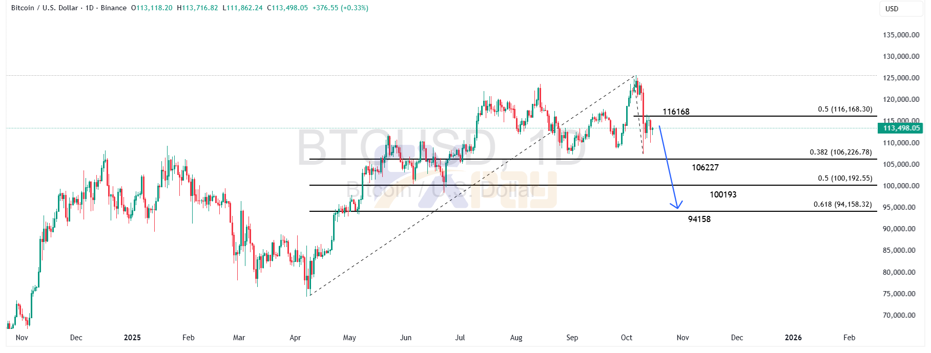 در حال حاضر قیمت حدود ۱۱۳,۳۰۰ دلار است و در نزدیکی ناحیهی حمایتی موقت ۱۱۰,۰۰۰ دلار در نوسان میباشد. با توجه به ساختار فیبوناچی و چارت اصلاحی، میتوان انتظار داشت که هدف بعدی بازار در محدودهی ۱۰۶,۲۲۷ دلار (سطح ۰/۳۸۲ فیبوناچی) باشد.در صورت ازدسترفتن این حمایت، منطقهی ۱۰۰,۱۹۳ دلار بهعنوان حمایت روانی و سپس سطح کلیدی ۹۴,۱۵۸ دلار (۰/۶۱۸ فیبوناچی اصلاحی) محتملترین مقصد نزولی خواهد بود.