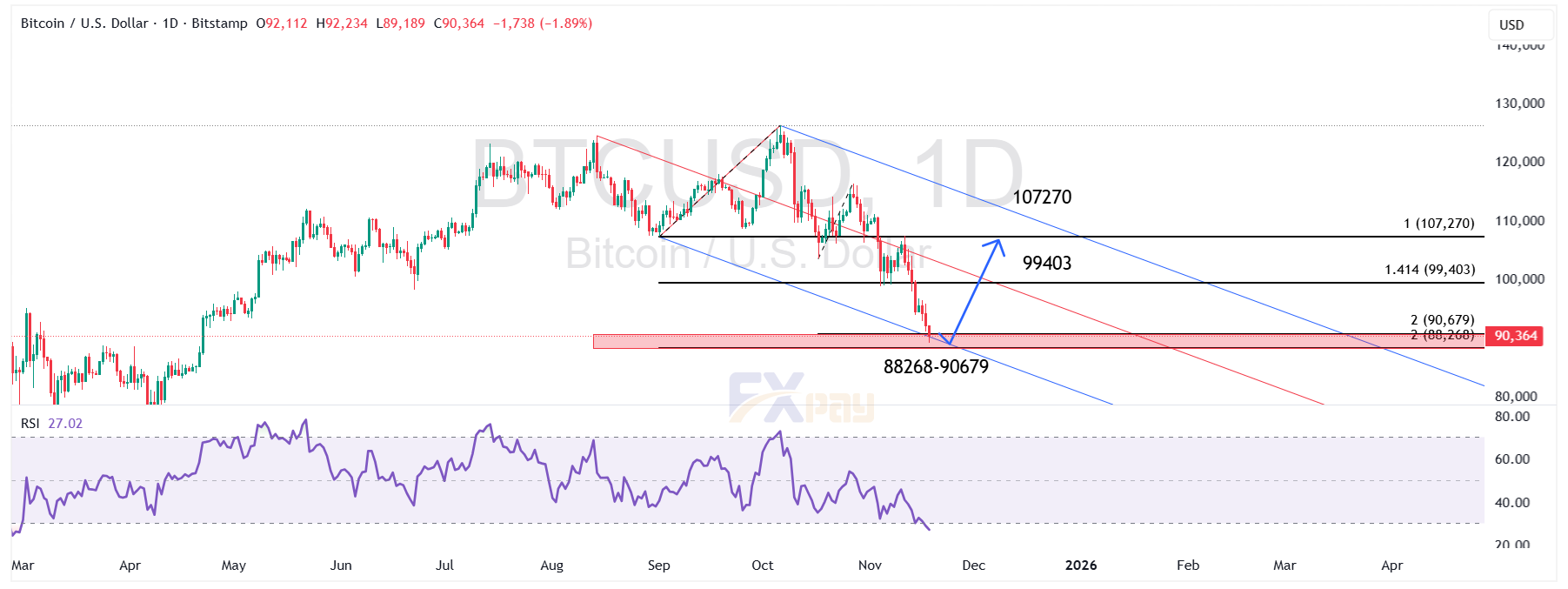 در نمودار روزانه، بیت‌کوین درون یک کانال نزولی میان‌مدت حرکت می‌کند که سقف و کف این کانال به‌وضوح روی نمودار قابل‌مشاهده است. فشار فروش پس از شکست سطح ۱۰۰,۰۰۰ دلار افزایش یافت و قیمت به محدوده حمایتی ۸۸,۲۶۸ تا ۹۰,۶۷۹ دلار وارد شد؛ این محدوده دقیقاً هم‌پوشانی فیبوناچی ۲/۰ از موج نزولی و همچنین کف ساختاری کندل‌های ماه اکتبر را نشان می‌دهد. به‌همین دلیل، می‌توان آن را مهم‌ترین منطقه برگشتی کوتاه‌مدت دانست.