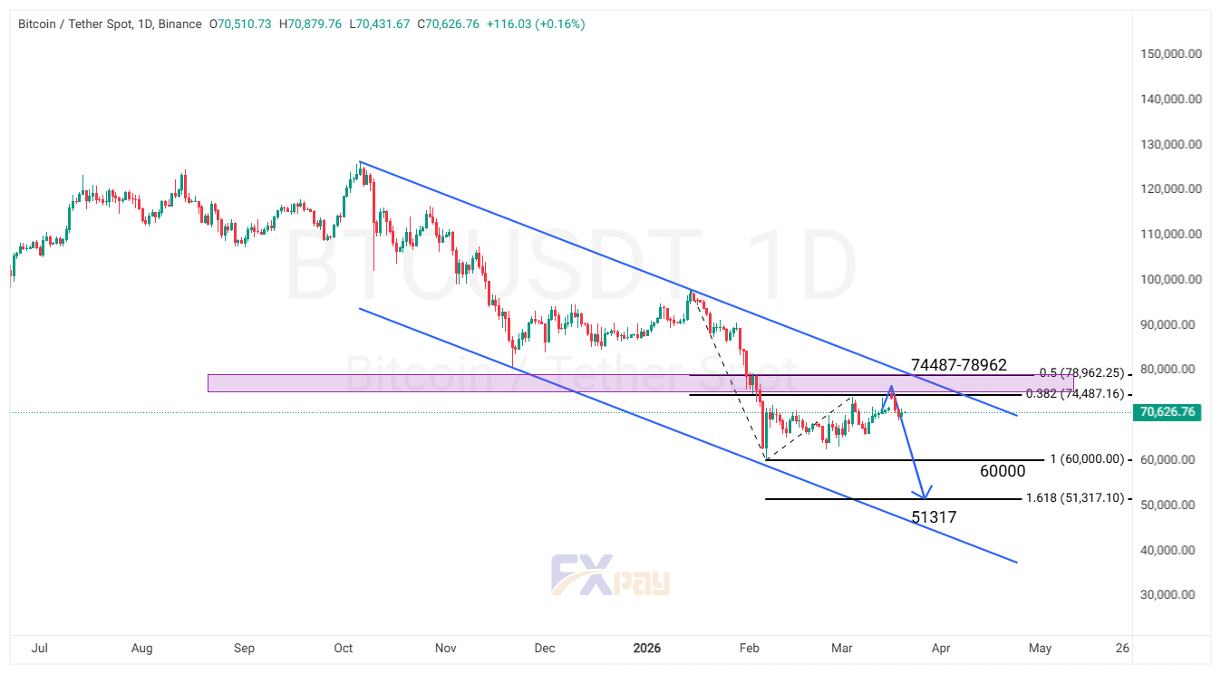 رفتار قیمت بیتکوین پس از برخورد به محدوده مقاومتی ۷۴,۴۸۷ تا ۷۸,۹۶۲ دلار، نشاندهنده ضعف تقاضا و بازگشت فشار فروش است. قیمت همچنان در یک کانال نزولی بزرگ قرار دارد و سقف کانال، دقیقا در همین ناحیه مقاومتی، مانع از ادامه صعود شده است.
