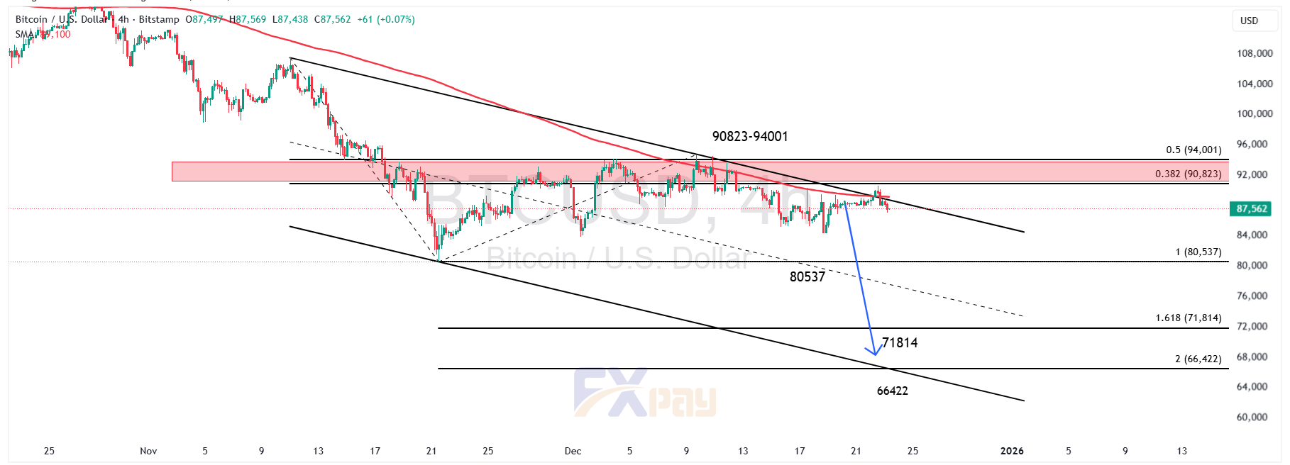ساختار تکنیکالی بیت‌کوین در تایم‌فریم چهار ساعته همچنان کاملاً نزولی است. قیمت در برخورد با مقاومت مهم ۹۰,۸۲۳ – ۹۴,۰۰۱ دلار بار دیگر با ریزش مواجه شد و از میانگین متحرک مهم (SMA) نیز به سمت پایین فاصله گرفت. این محدوده مقاومتی، سقف کانال نزولی و تراز ۰/۳۸۲ فیبوناچی را شامل می‌شود که آن را به یکی از قوی‌ترین دیوارهای عرضه در ساختار کنونی تبدیل کرده است.