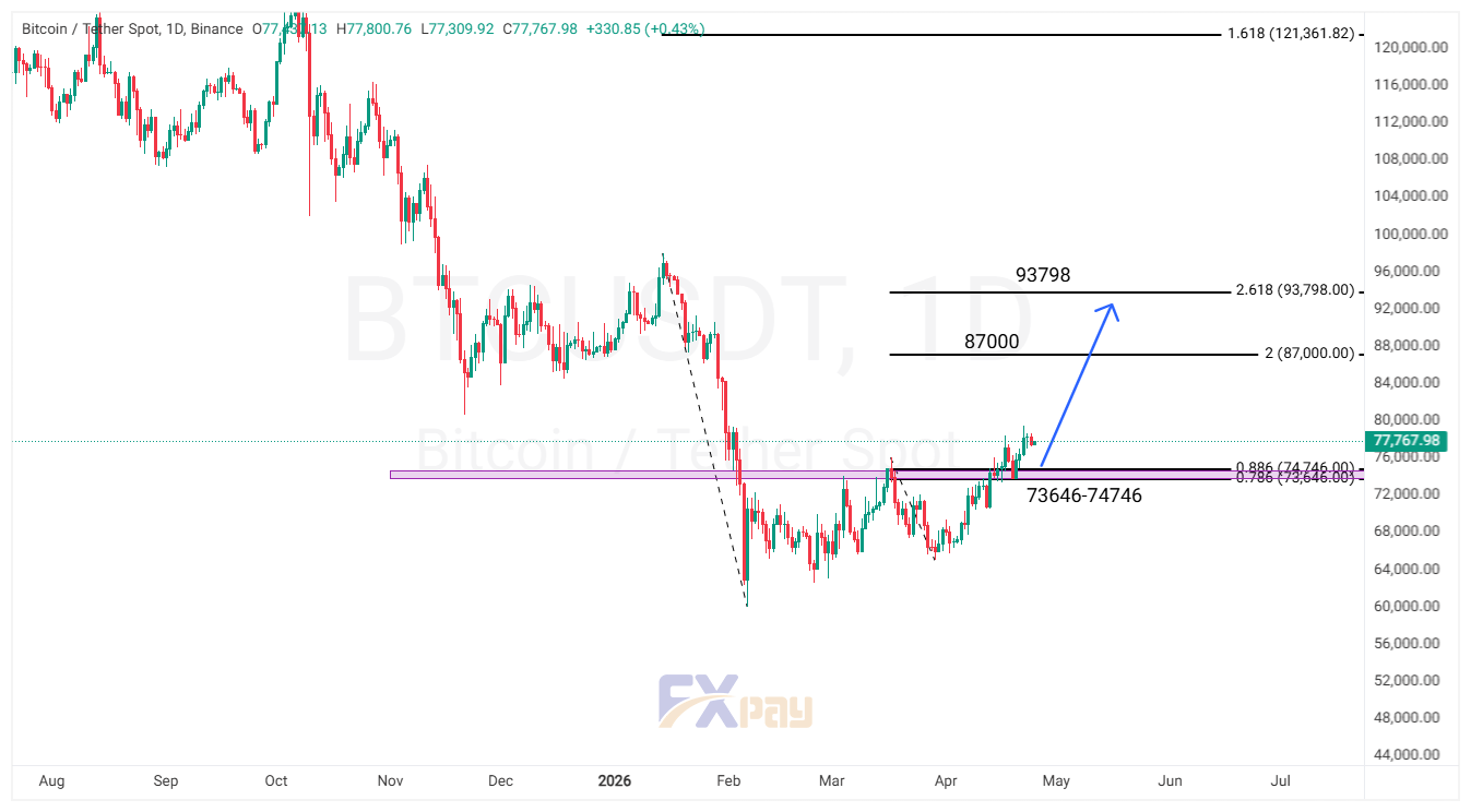 در حال حاضر قیمت در محدوده ۷۷,۷۶۰ دلار در حال نوسان است و نشانههایی از ادامه روند صعودی در نمودار دیده میشود. در صورتی که این ساختار حفظ شود، مسیر حرکت قیمت میتواند به سمت مقاومتهای مهم بالاتر از جمله ۸۷,۰۰۰ دلار و سپس ۹۳,۷۹۸ دلار ادامه پیدا کند.