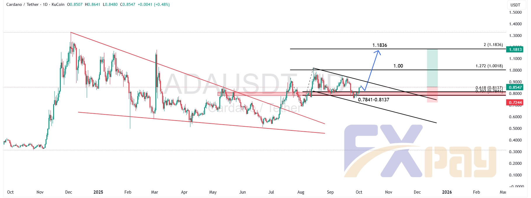 در نسخه آپدیت‌شده (۲ اکتبر ۲۰۲۵)، ADA پس از یک اصلاح جزئی، به محدوده حمایتی قدرتمند ۰/۷۸۴۱ – ۰/۸۱۳۷ دلار برگشته و بخش قابل‌توجهی از فشار فروش را جذب کرده است. واکنش قیمت به این سطح مثبت بوده و نشانه‌های برگشت به سمت مقاومت‌های بالاتر را تقویت کرده است.