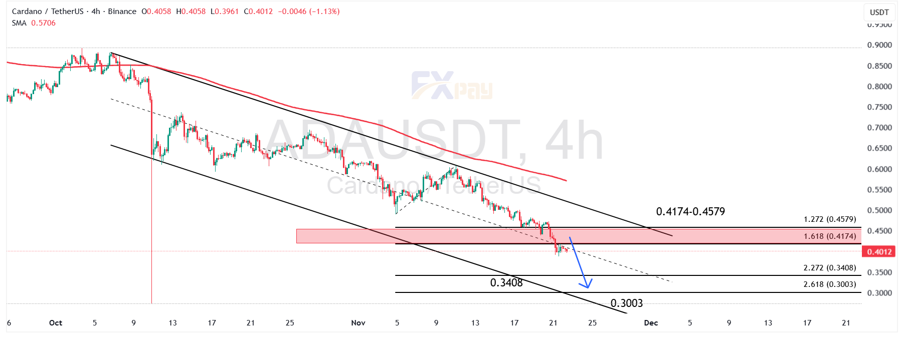 بررسی ساختار تکنیکالی کاردانو در تایمفریم چهار ساعته نشان میدهد که قیمت داخل یک کانال نزولی گسترده قرار دارد که از اوایل ماه اکتبر آغاز شده و همچنان فعال است. رفتار قیمت در برخورد با سقف و کف این کانال نشان میدهد که این ساختار کاملاً معتبر است و جریان نزولی با قدرت ادامه دارد.