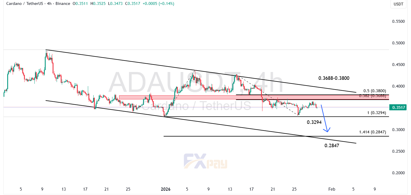 در بررسی نمودار آپدیت شده، کاردانو همچنان درون یک کانال نزولی بلندمدت نوسان میکند. قیمت اخیراً تلاشی برای عبور از ناحیه مقاومتی ۰/۳۶۸۸ تا ۰/۳۸۰۰ دلار (باکس قرمز رنگ) داشت که با شکست مواجه شد. این ناحیه که با ترازهای اصلاحی ۳۸/۲ و ۵۰ درصد فیبوناچی همپوشانی دارد، به عنوان سد نفوذناپذیری عمل کرده است. آرایش کندلها و سایههای بلند از بالا، نشاندهنده فشار فروش سنگین در این ناحیه است. فلش آبی رنگ ترسیم شده، مسیر نزولی قیمت را به سمت کفهای جدید نشان میدهد.