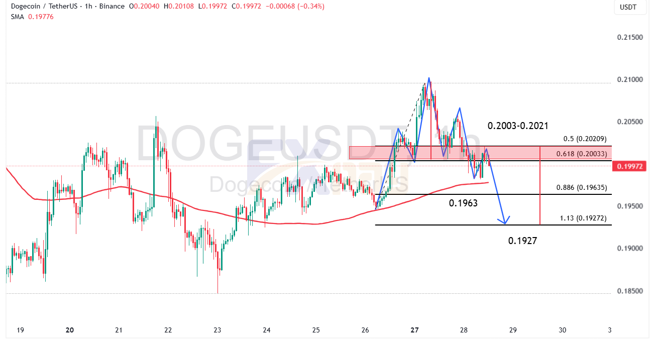 در نمودار تحلیلی، مشخص است که پس از برخورد به مقاومت یادشده، کندلهای نزولی پشت سر هم ایجاد شده و قیمت اکنون در محدوده حدودی ۰/۲۰ دلار نوسان میکند. میانگین متحرک ۲۰۰ دورهای (در محدودهی ۰/۱۹۷۷ دلار) نیز در حال از دست رفتن است که تأییدی بر تداوم روند نزولی فعلی محسوب میشود.