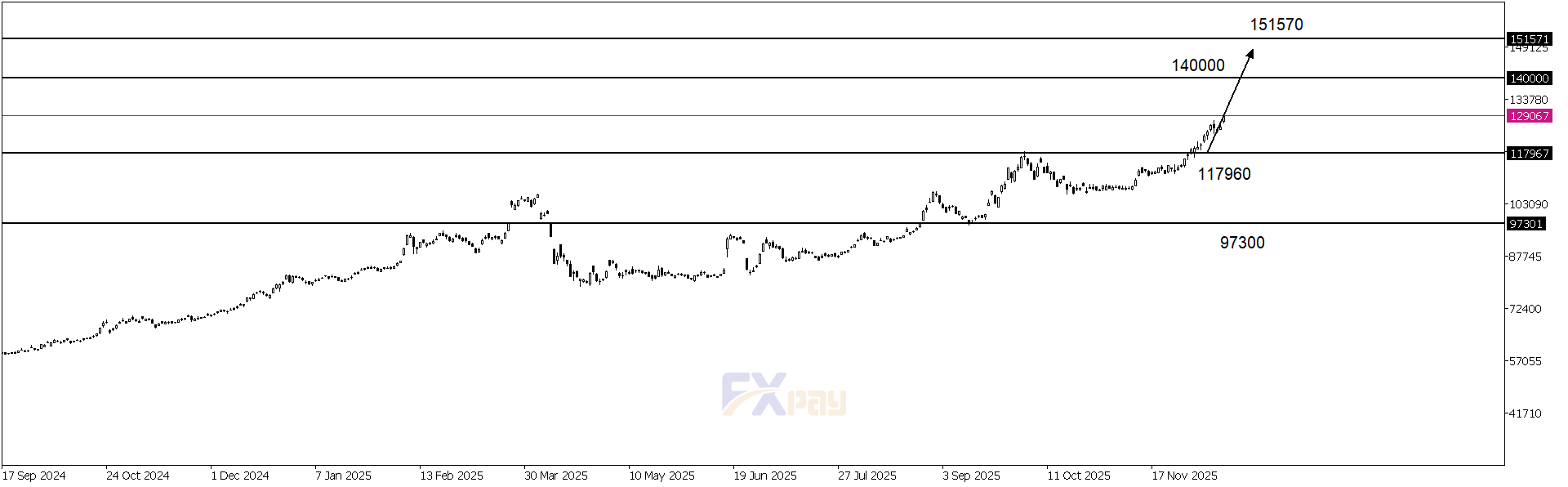در صورت حفظ حمایت ۱۱۷,۹۶۰ تومان، بازار آمادۀ ادامه صعود خواهد بود. شکست مقاومت ۱۴۰,۰۰۰ تومان آغازگر فاز جدید رشد است و میتواند موجی از تقاضا را فعال کند. در این صورت: