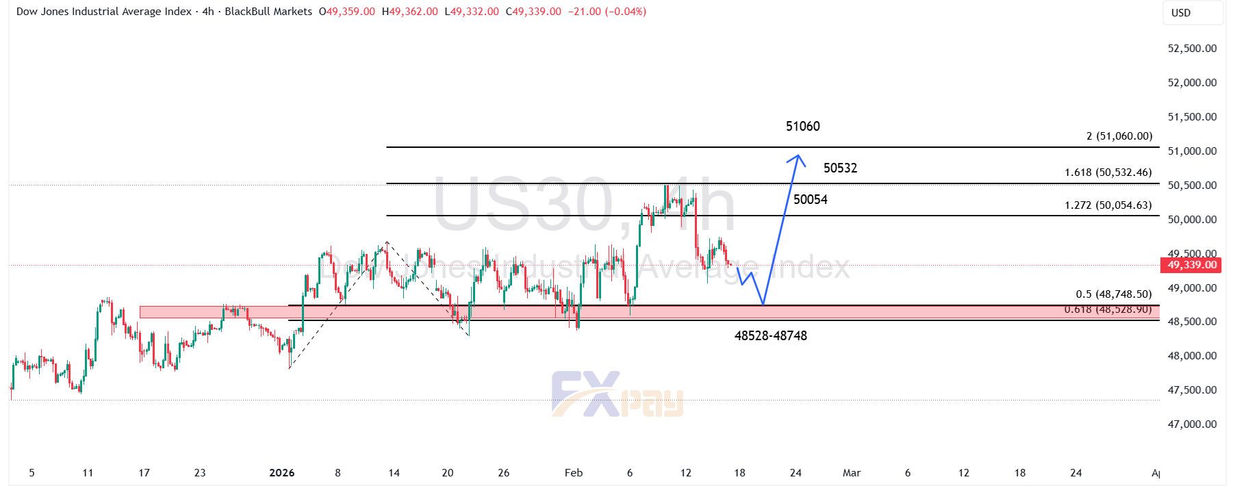 شاخص داوجونز در یک موقعیت “خرید در اصلاح” (Buy the Dip) قرار دارد. از نظر تکنیکالی، قیمت به محدوده جذاب ۴۸,۵۲۸-۴۸,۷۴۸ واحد رسیده که با ترازهای فیبوناچی حمایت میشود.