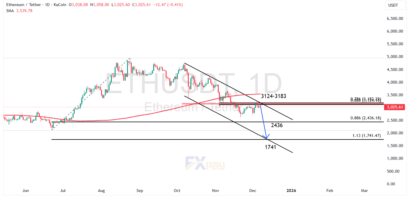 ساختار فعلی اتریوم در تایمفریم یکروزه نشان میدهد که قیمت بار دیگر پس از برخورد به مقاومت ۳,۱۸۳ – ۳,۱۲۴ دلار، با فشار شدید فروش مواجه شده و به داخل کانال نزولی برگشته است. این محدوده نهتنها سقف کانال محسوب میشود، بلکه همزمان با سطح ۰/۸۸۶ فیبوناچی در قیمت ۳,۱۲۳/۲۸ دلار قرار دارد که اهمیت آن را دوچندان میکند.