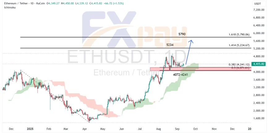 در تحلیل قبلی، پیش‌بینی شد که محدوده حمایتی ۴,۰۷۲ – ۴,۲۴۱ دلار می‌تواند نقش تعیین‌کننده برای ادامه مسیر صعودی ایفا کند. قیمت با حفظ این حمایت و تثبیت بر فراز ابر ایچیموکو، نشانه‌های قدرت خریداران را حفظ کرده است.