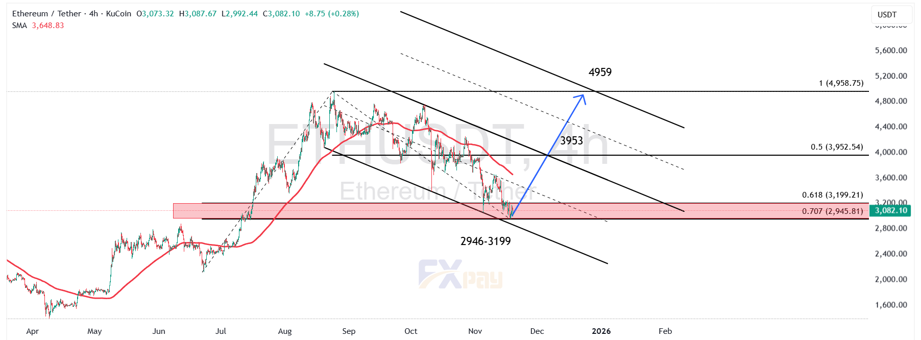این سطح نخستین لایه مهم حفاظتی برای اتریوم محسوب میشود. سطح ۳,۱۹۹ دلار محل دقیق تراز فیبوناچی ۰/۶۱۸ است و معمولاً در روندهای اصلاحی قوی، واکنشهای جدی در همین محدوده دیده میشود. تثبیت چند کندل بالای این سطح در تایمفریم ۴ ساعته، نشانه اولیه پایان اصلاح و آغاز فاز حمایتی خریداران است.
