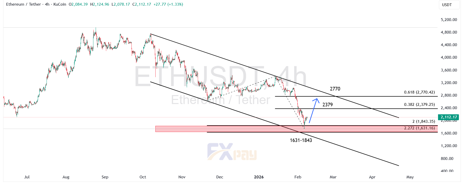 در بررسی نمودار آپدیت شده در تایم فریم ۴ ساعته، اتریوم پس از یک اصلاح عمیق و فرسایشی، به “ناحیه خرید طلایی” در محدوده ۱,۶۳۱ تا ۱,۸۴۳ دلار (باکس قرمز رنگ) رسیده است. این محدوده که با ترازهای فیبوناچی اکستنشن ۲ و ۲/۲۷۲ همپوشانی دارد، به عنوان آخرین سنگر خریداران و منطقهای برای چرخش ماژور قیمت عمل میکند.
