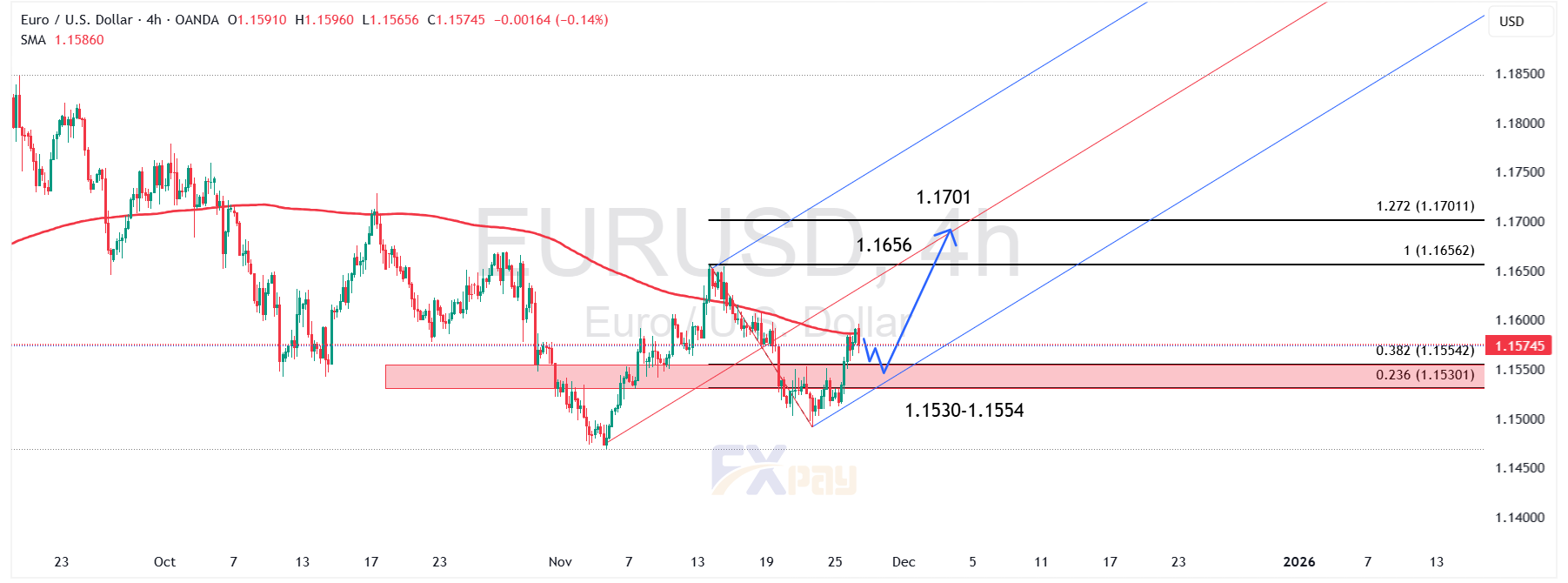 بررسی ساختار نمودار چهارساعته نشان میدهد که قیمت در یک فاز اصلاحی عمیق قرار گرفته بود و پس از لمس سطوح پایین، اکنون به مهمترین محدوده حمایتی میانمدت، یعنی ۱/۱۵۳۰ تا ۱/۱۵۵۴ دلار رسیده است. این منطقه نهتنها یک ناحیه تقاضای کلاسیک در چارت است، بلکه با سطح فیبوناچی ۰/۲۳۶ نیز همپوشانی دارد؛ موضوعی که اهمیت بازگشتی آن را دوچندان میکند.