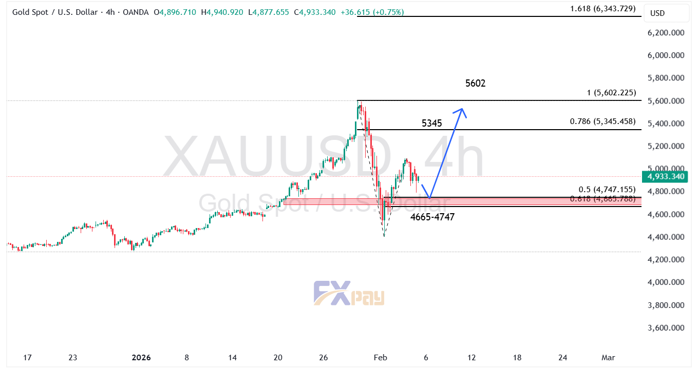 در بررسی نمودار آپدیت شده در تایم فریم ۴ ساعته، اونس طلا پس از برخورد به مقاومت ۵,۶۰۰ دلار، اصلاحی شارپ را تجربه کرده و اکنون به ناحیه حمایتی بسیار معتبر ۴,۶۶۵ تا ۴,۷۴۷ دلار (باکس قرمز رنگ) رسیده است. این محدوده که با ترازهای اصلاحی ۵۰ و ۶۱.۸ درصد فیبوناچی همپوشانی دارد، به عنوان یک سکوی پرتاب قدرتمند برای قیمت عمل میکند.