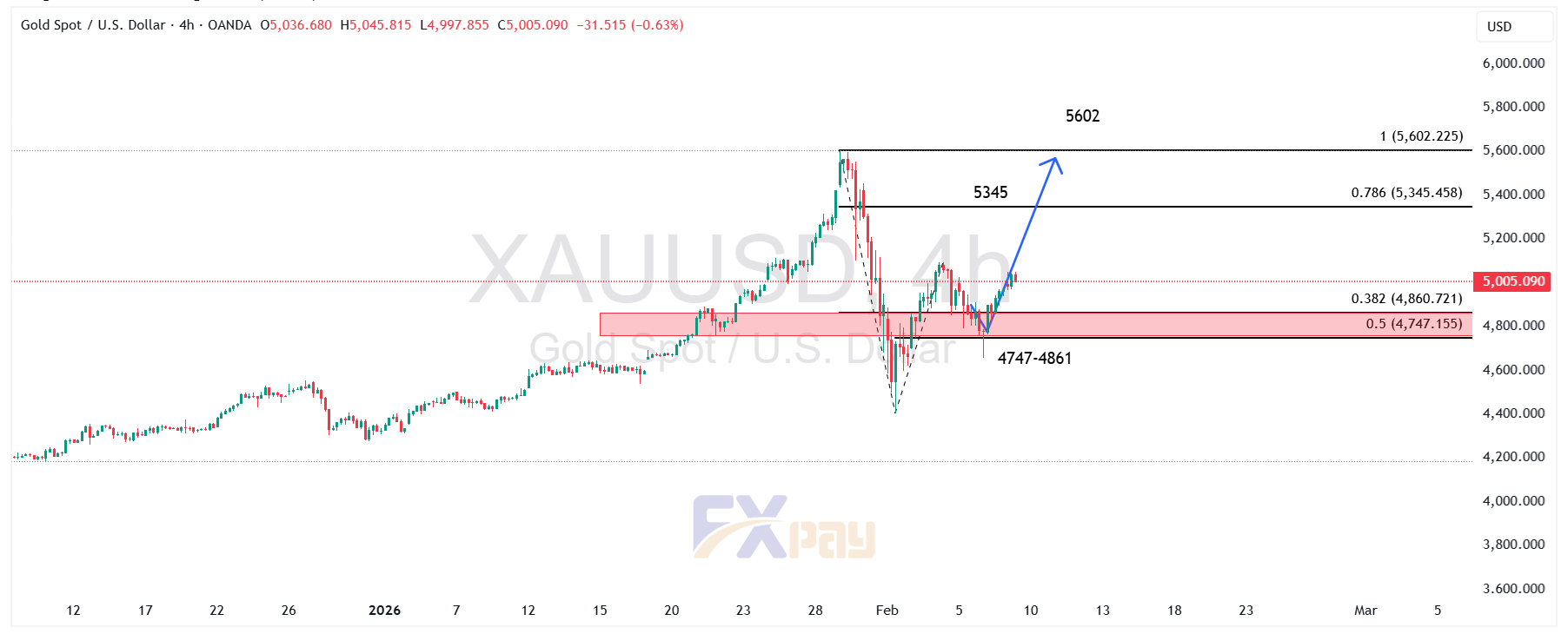 در بررسی نمودار آپدیت شده در تایم فریم ۴ ساعته، طلا پس از اصلاح قیمت، به ناحیه حمایتی بسیار معتبر ۴,۷۴۷ تا ۴,۸۶۱ دلار (باکس قرمز رنگ) واکنش مثبت نشان داده است. این محدوده که با ترازهای اصلاحی ۳۸/۲ و ۵۰ درصد فیبوناچی همپوشانی دارد، به عنوان یک سکوی پرتاب عمل کرده و قیمت را به بالای ۵,۰۰۰ دلار بازگردانده است.