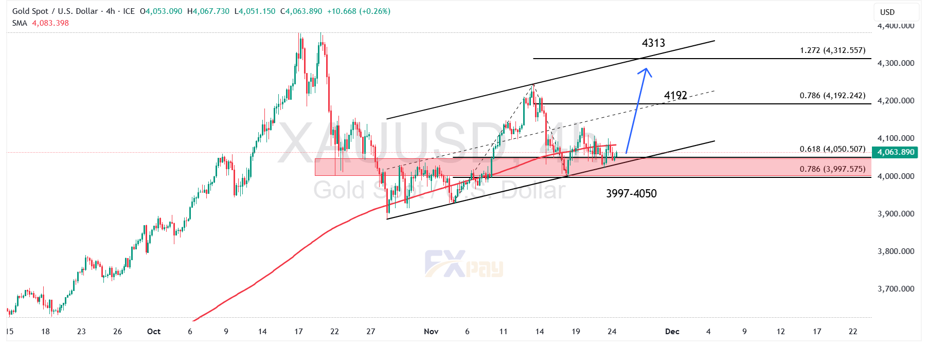 بررسی رفتار قیمت در نمودار چهارساعته نشان میدهدکه طلا همچنان در یک کانال صعودی میانمدت در حال معامله است و واکنش اخیر به ناحیه حمایتی ۳,۹۹۷ تا ۴,۰۵۰ دلار نشان میدهد خریداران هنوز قصد دارند از ساختار فعلی محافظت کنند. این بازه حمایتی دقیقا بر روی نسبتهای فیبوناچی مهم قرار گرفته؛ بهطوریکه عدد ۴,۰۵۰/۵۰ منطبق بر تراز ۰/۶۱۸ و عدد ۳,۹۹۷/۵۷ منطبق بر تراز ۰/۷۸۶ است. این همزمانی فیبوناچی با کف کانال صعودی باعث شده این ناحیه به یکی از کلیدیترین سطوح حمایتی طلا تبدیل شود.