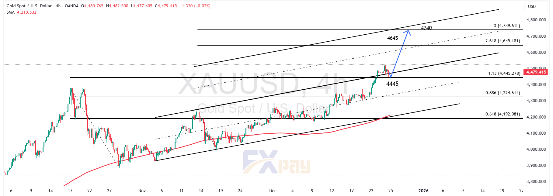 اونس جهانی طلا پس از ثبت رکورد تاریخی در سطح ۴,۵۲۵ دلار، وارد فاز اصلاحی کوتاهمدت شده است. حرکات اخیر قیمت، ترکیبی از ذخیره سود توسط معاملهگران و تثبیت ساختار در محدودهی حمایتی کلیدی ۴,۴۴۵ دلار را نشان میدهد. بر اساس ساختار فعلی، طلا در تایمفریم ۴ ساعته هنوز درون کانال صعودی میانمدت قرار دارد و احتمال شکلگیری موج جدید رشد تا محدودهی ۴,۶۴۵ دلار و حتی ۴,۷۴۰ دلار وجود دارد.