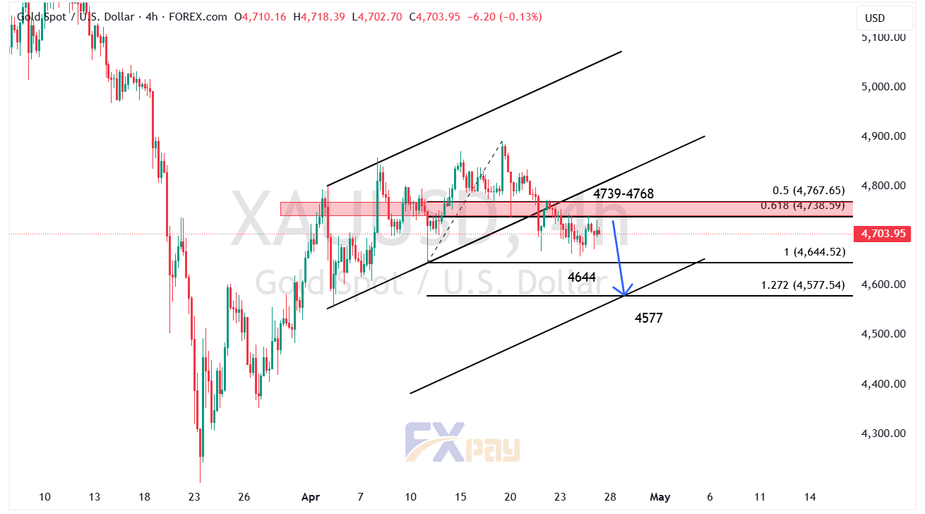 در ادامه فشار فروش از مقاومت ۴,۷۳۹ تا ۴,۷۶۸ دلار، احتمال لمس مجدد ۴,۶۴۴ دلار بسیار بالا است. شکست این سطح مسیر را برای برخورد به ۴,۵۷۷ دلار و حتی محدوده کف کانال باز می‌کند. این سناریو تا زمانی معتبر است که قیمت زیر مقاومت‌های یادشده باقی بماند.