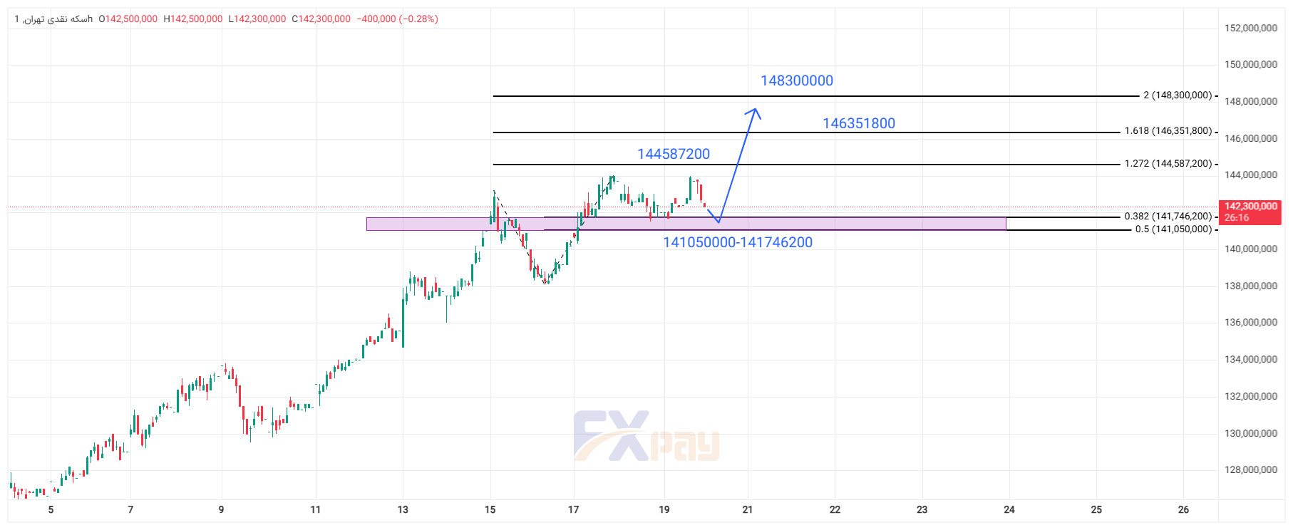 در صورت تثبیت بالای این ناحیه حمایتی، مسیر قیمت میتواند بهصورت پلکانی تا سطوح ۱۴۴,۵۸۷,۲۰۰ تومان، ۱۴۶,۳۵۱,۸۰۰ تومان و نهایتاً ۱۴۸,۳۰۰,۰۰۰ تومان ادامه یابد. این اهداف دقیقاً بر اساس ترازهای فیبوناچی ۱/۲۷۲، ۱/۶۱۸ و ۲/۰۰۰ مشخص شدهاند و سطحسنجی قیمتی معتبر به شمار میآیند.