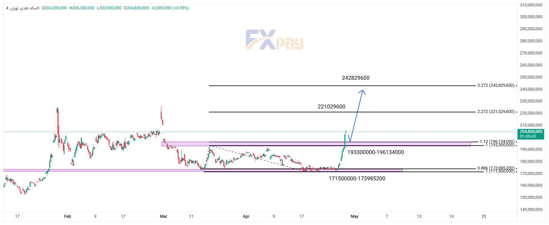 در صورت تثبیت قیمت بالای این محدوده، اهداف بعدی بهترتیب ۲۲۱,۰۲۹,۶۰۰ تومان و ۲۴۲,۸۲۹,۶۰۰ تومان خواهند بود؛ محدودههایی که بر مبنای فیبوناچی ۲/۲۷۲ و ۳/۲۷۲ محاسبه شده و در چارت نیز مشخص هستند.