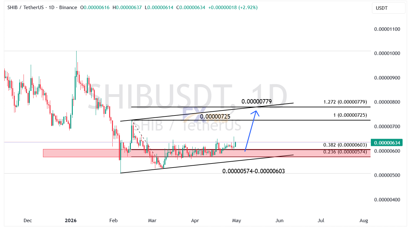 در صورتی که قیمت بتواند حمایت ۰/۰۰۰۰۰۵۷۴ تا ۰/۰۰۰۰۰۶۰۳ دلار را حفظ کند، احتمال حرکت به سمت مقاومتهای بالاتر افزایش مییابد.