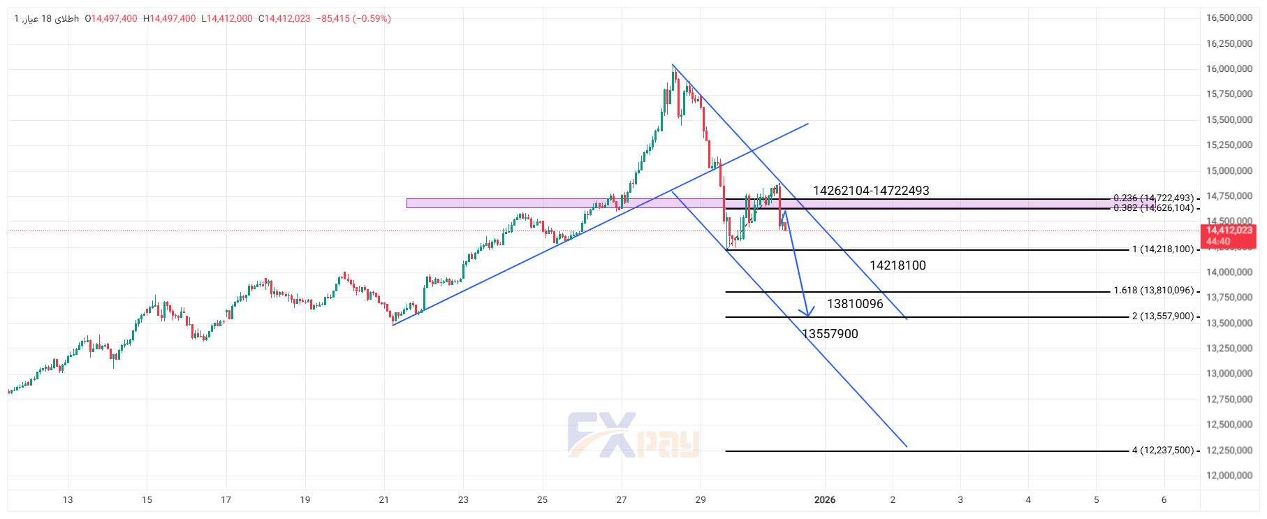در بررسی نمودار قیمتی طلای ۱۸ عیار پس از یک رالی صعودی، با برخورد به سقفهای قیمتی و تشکیل ساختار بازگشتی، خط روند صعودی خود را شکسته است. اکنون قیمت زیر بازه مقاومتی سنگین ۱۴,۲۶۲,۱۰۴ تا ۱۴,۷۲۲,۴۹۳ تومان (باکس بنفش رنگ) قرار گرفته است. شکست سطح فیبوناچی ۱ در قیمت ۱۴,۲۱۸,۱۰۰ تومان، سیگنال نزولی را تقویت کرده و فلش آبی رنگ ترسیم شده، مسیر قیمت را به سمت اهداف پایینتر نشان میدهد. مادامی که قیمت زیر این باکس مقاومتی نوسان میکند، دیدگاه تکنیکال کاملاً نزولی است.