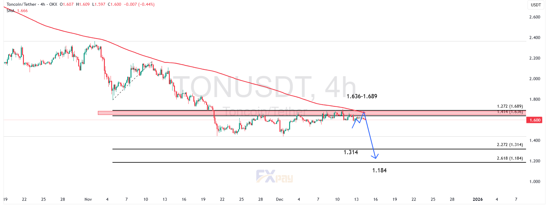 تون‌کوین در تایم‌فریم ۴ ساعته همچنان زیر مقاومت بسیار قدرتمند ۱/۶۳۶ – ۱/۶۸۹ دلار قرار دارد؛ ناحیه‌ای که ساختار عرضه میان‌مدت را شکل داده و با شیب نزولی میانگین متحرک SMA200 هم‌پوشانی دارد. این هم‌زمانی یکی از قوی‌ترین سیگنال‌های بازگشتی نزولی است و نشان می‌دهد بازار هنوز آمادگی شکست صعودی این محدوده را ندارد.