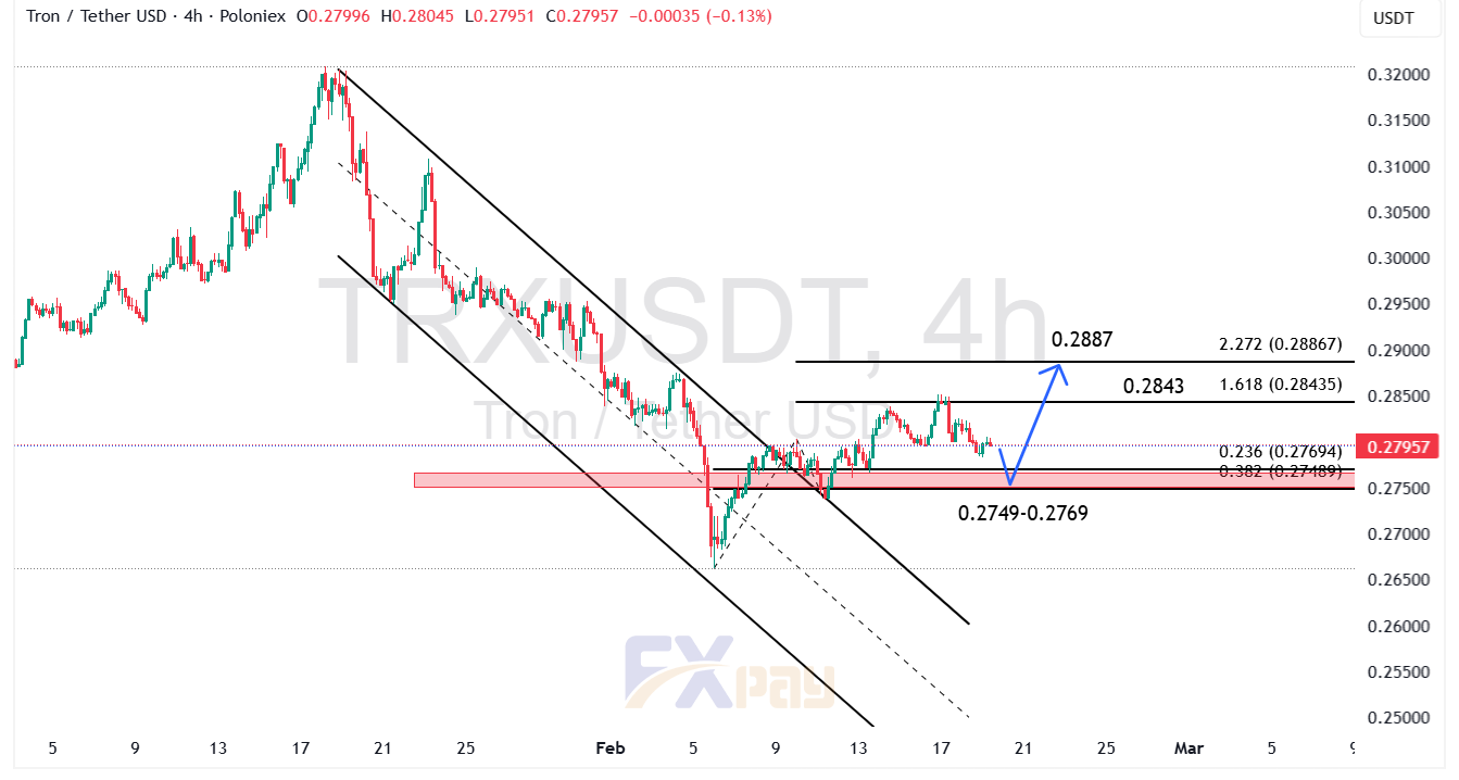 روند قیمتی ترون در تایم فریم ۴ ساعته نشان از قدرت بالای خریداران و تمایل به تشکیل سقفهای جدید دارد. با بررسی دقیق نمودار، مشاهده میکنیم که قیمت پس از یک فاز اصلاحی، به زیبایی روی بازه حمایتی ۰/۲۷۴۹ تا ۰/۲۷۶۹ دلار واکنش مثبت نشان داده است. تشکیل سایههای پایینی (Shadow) در این محدوده، نشاندهنده دفاع تمامقد خریداران و ورود نقدینگی جدید به بازار است. این بازه حمایتی اکنون به عنوان یک سکوی پرتاب قدرتمند عمل کرده و مومنتوم صعودی لازم برای شکستن مقاومتهای پیش رو را فراهم آورده است.