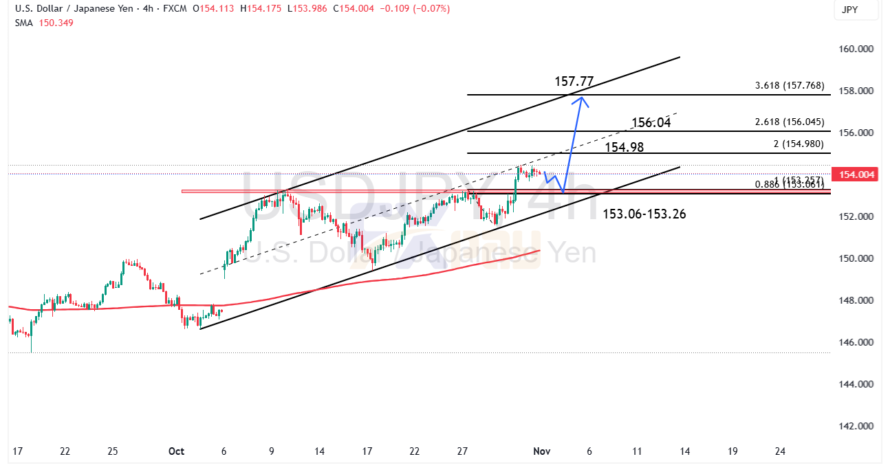 در صورتی که حمایت ۱۵۳/۰۶ – ۱۵۳/۲۶ ین حفظ شود و قیمت بالاتر از ۱۵۴/۵۰ ین تثبیت گردد، احتمال حرکت صعودی تا ۱۵۴/۹۸ ین بهعنوان هدف اول بسیار بالاست.