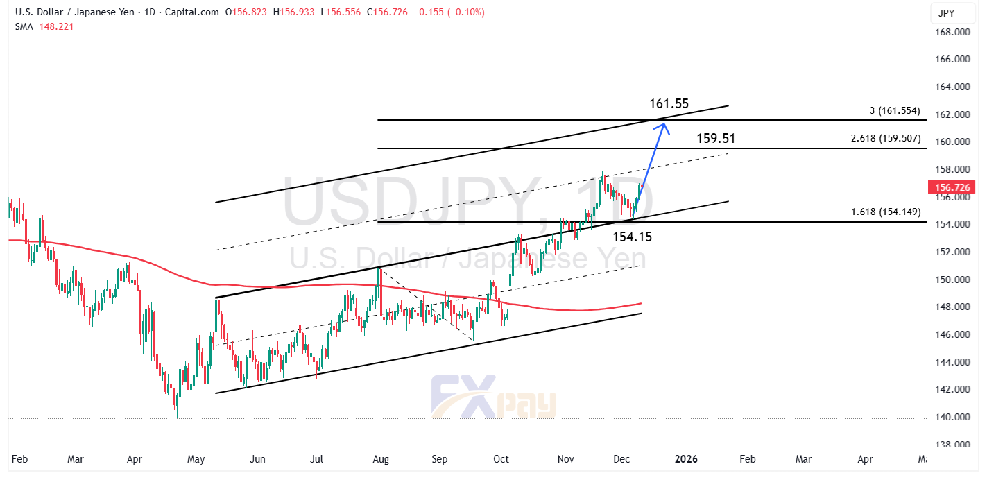 دلار/ین در یکی از حساسترین ساختارهای تکنیکالی ماههای اخیر قرار دارد. حفظ حمایت ۱۵۴/۱۵ نشاندهنده آمادگی بازار برای ادامه حرکت به سوی مقاومت کلیدی ۱۵۹/۵۱ و سپس ۱۶۱/۵۵ است. در سمت بنیادی نیز سیاستهای بانک مرکزی ژاپن، ضعف عمدی ین، نیاز به تقویت صادرات، فشارهای ژئوپلیتیک با چین و تقویت دلار در بازارهای جهانی، همگی شرایط را برای استمرار روند صعودی مهیا کردهاند.