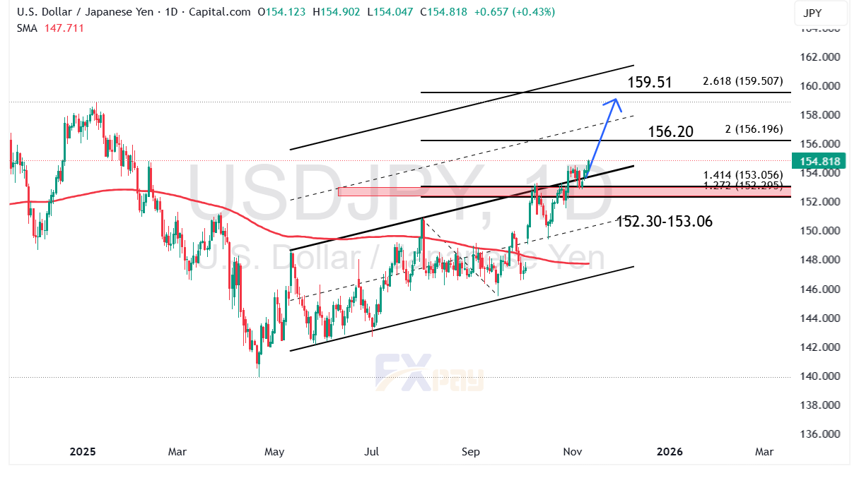 از منظر فنی، جفتارز USDJPY از کف حمایتی ۱۵۲/۳۰ تا ۱۵۳/۰۶ ین ژاپن جهش کرده است. در این محدوده همپوشانی ترازهای فیبوناچی ۱/۲۷۲ و ۱/۴۱۴ وجود دارد که در تحلیل ساختاری، نقش ناحیه انباشت را ایفا میکند. از این سطح، قیمت وارد کانال صعودی شده و هدف میانمدت در ناحیه ۱۵۶/۲۰ ین (تراز فیب ۲) و هدف بلندمدت در محدوده ۱۵٩/۵۱ ین (تراز فیب ۲/۶۱۸) دیده میشود.