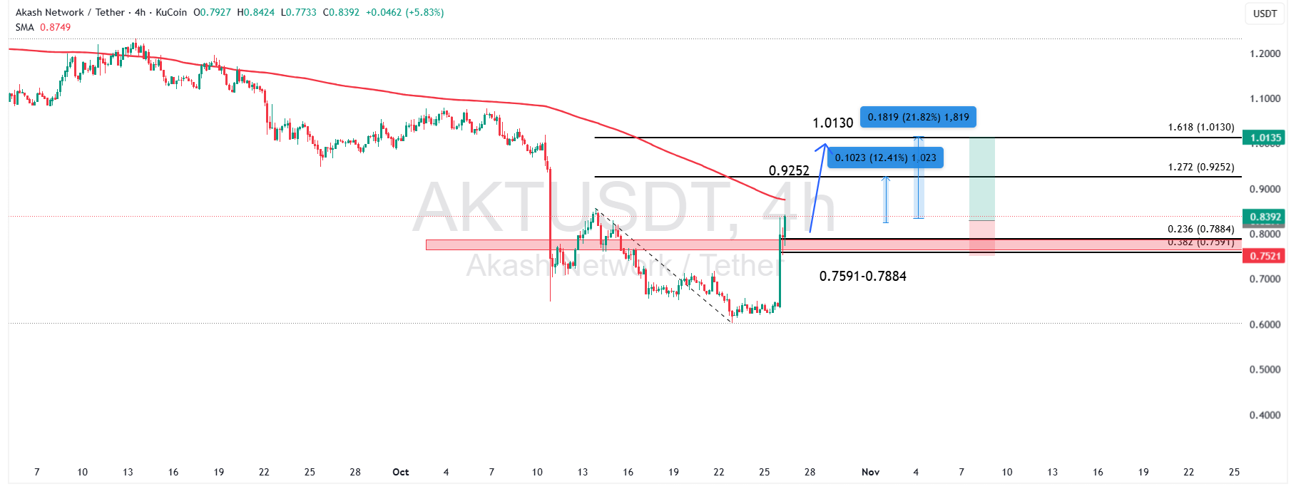 قیمت فعلی AKTUSDT در محدوده ۰/۸۳۶۷ دلار قرار دارد و پس از تشکیل یک کف دوقلو در ناحیه ۰/۷۵۹۱ تا ۰/۷۸۸۴ دلار، موفق به شکست روند نزولی و عبور از مقاومت میانمدت شده است. این بازگشت قدرتمند در تایمفریم ۴ ساعته با عبور از میانگین متحرک SMA200 تأیید شده و میتواند آغازگر یک موج صعودی تازه باشد.
