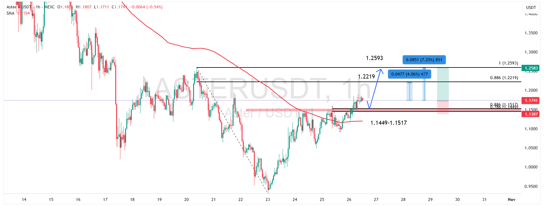 قیمت AsterUSDT در حال حاضر در محدوده ۱/۱۷۲ دلار معامله میشود و پس از شکست روند نزولی کوتاهمدت، در حال تثبیت بالای سطح حمایتی ۱/۱۴۴ تا ۱/۱۵۱ دلار است. این ناحیه با سطح ۰/۶۱۸ فیبوناچی اصلاحی و میانگین متحرک (SMA) بلندمدت همپوشانی دارد و به عنوان یک زون حمایتی کلیدی در تایمفریم ۱ ساعته محسوب میشود.