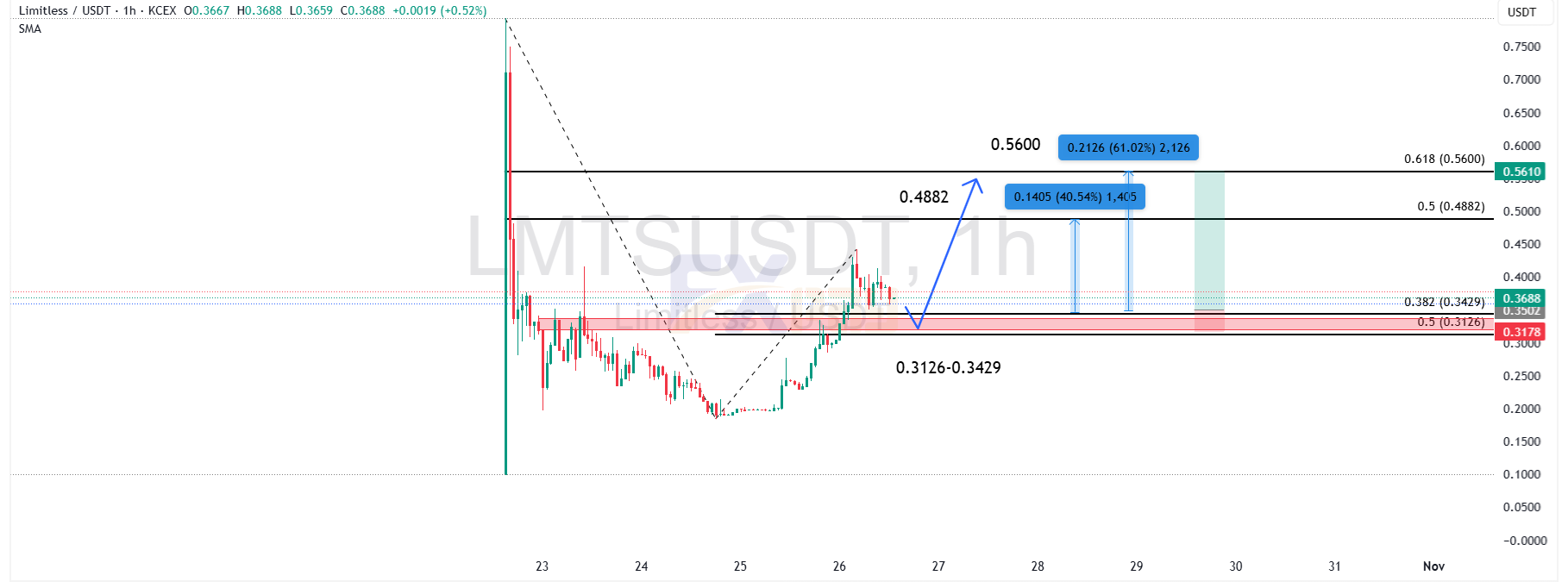قیمت فعلی LMTSUSDT در محدوده ۰/۳۵۹۵ دلار قرار دارد و پس از ریزش اخیر، اکنون در حال تشکیل ساختار بازگشتی صعودی از ناحیه ۰/۳۱۲۶ تا ۰/۳۴۲۹ دلار است که با تراز ۰/۳۸۲ فیبوناچی اصلاحی همپوشانی دارد.این محدوده بهعنوان زون حمایتی معتبر شناخته میشود و واکنش مثبت قیمت به آن میتواند شروع موج جدیدی از رشد باشد.
