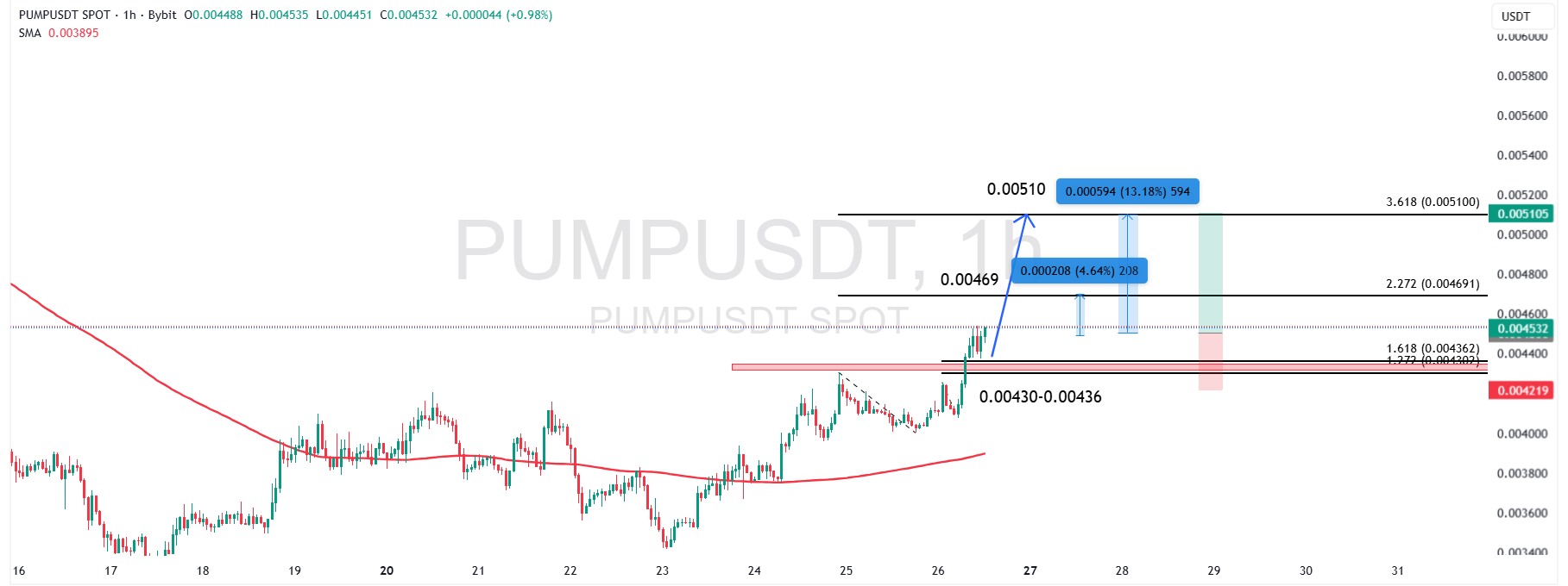 قیمت فعلی PUMPUSDT در محدوده ۰/۰۰۴۵۲ دلار قرار دارد و پس از شکست مقاومت استاتیک و میانگین متحرک SMA200، اکنون در حال تثبیت بالای محدوده حمایتی جدید ۰/۰۰۴۳۰ تا ۰/۰۰۴۳۶ دلار است. این سطح با تراز ۱/۶۱۸ فیبوناچی اصلاحی همپوشانی دارد و بهعنوان ناحیهای کلیدی برای ادامه روند صعودی عمل میکند.