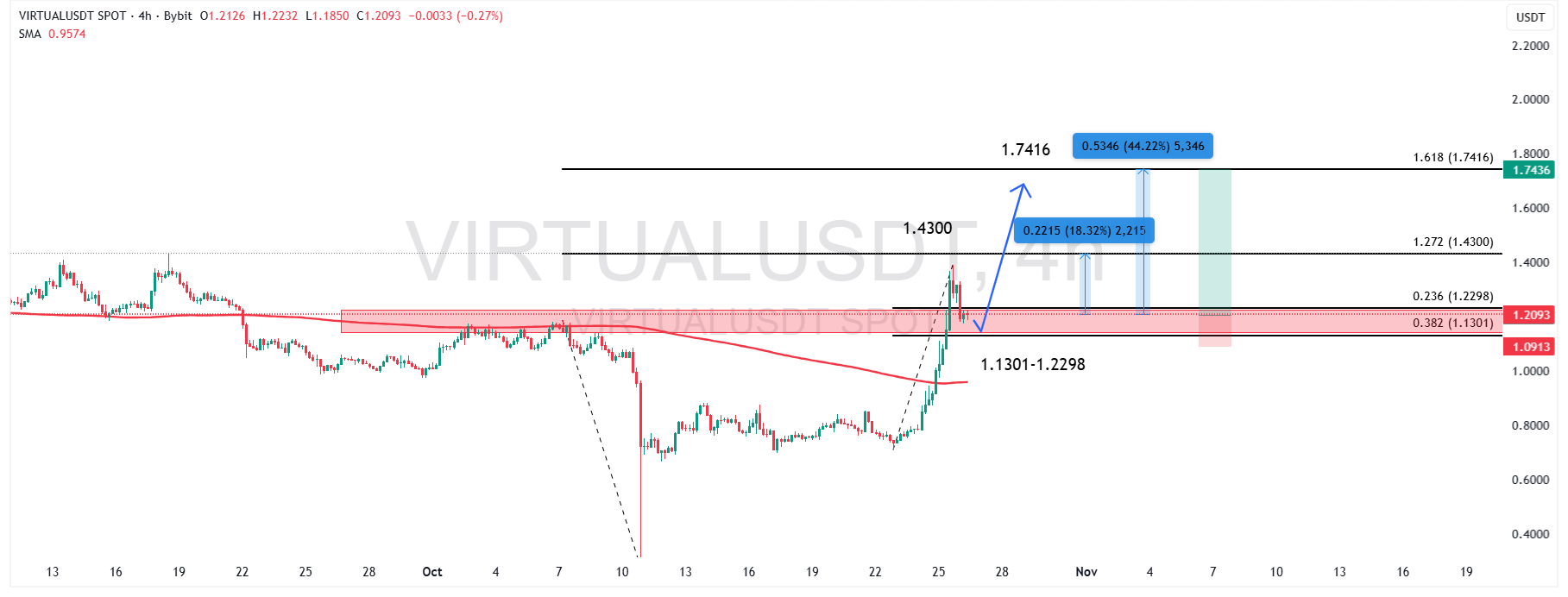 قیمت فعلی VIRTUALUSDT در محدوده ۱/۲۱۱ دلار قرار دارد و پس از جهش قوی از کف قبلی، اکنون در حال پولبک به ناحیه حمایتی ۱/۱۳۰۱ تا ۱/۲۲۹۸ دلار است. این محدوده با ترازهای ۰/۲۳۶ و ۰/۳۸۲ فیبوناچی اصلاحی و همچنین میانگین متحرک SMA200 همپوشانی دارد و نقش بسیار مهمی در تعیین ادامه روند ایفا میکند.
