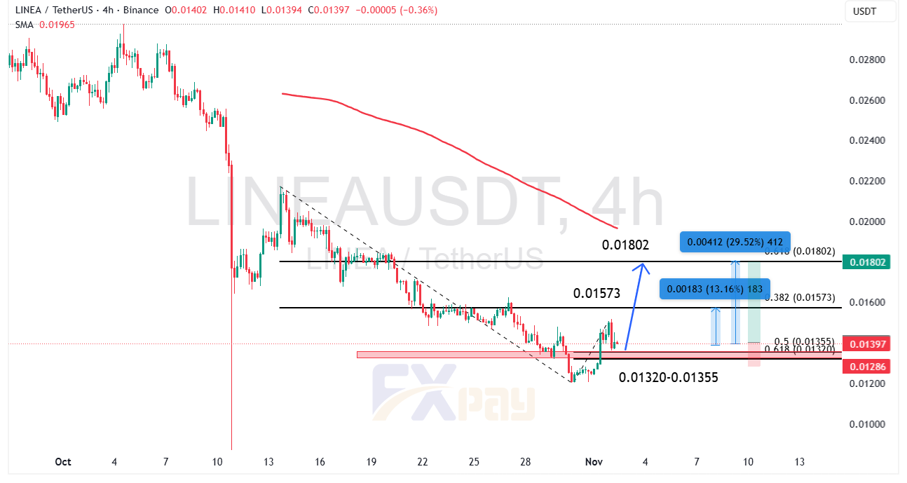 نمودار چهارساعته LINEAUSDT نشان میدهد که این رمزارز پس از یک دوره اصلاح شدید قیمتی، در حال واکنش به ناحیه حمایتی کلیدی ۰/۰۱۳۲۰ تا ۰/۰۱۳۵۵ دلار است. این منطقه با نسبتهای فیبوناچی ۰/۵ و ۰/۶۱۸ همپوشانی دارد و مانند یک ناحیه تقاضای قوی عمل کرده است.
